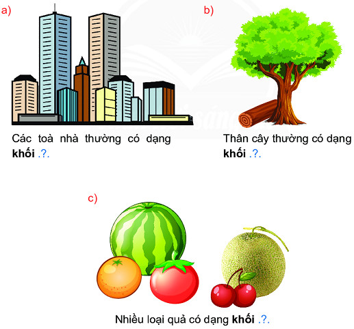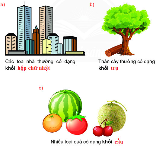 Quan sát hình vẽ rồi kể tên các đồ vật có dạng khối trụ, khối cầu, khối hộp chữ nhật.