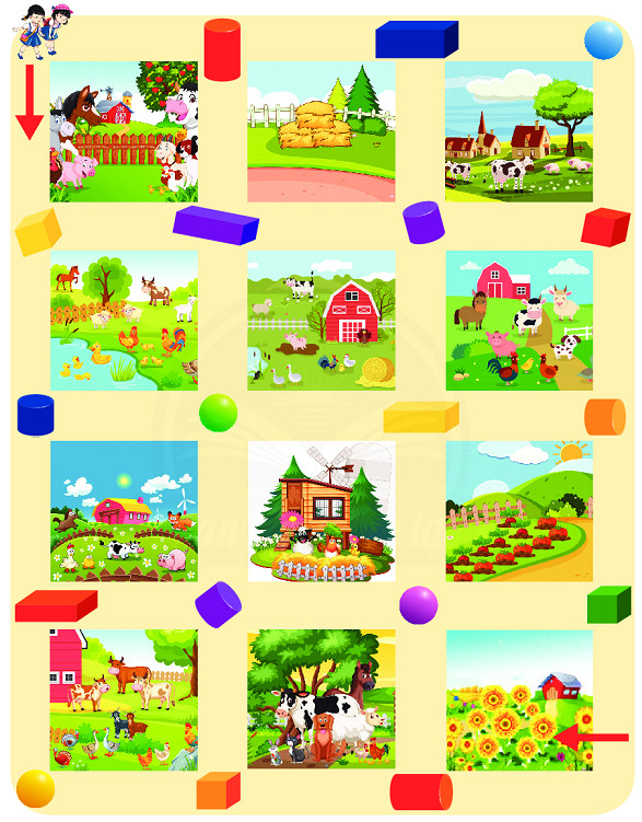 Xác định hình dạng của các khối rồi đi theo đường không có khối trụ để đến trang trại trồng hoa.