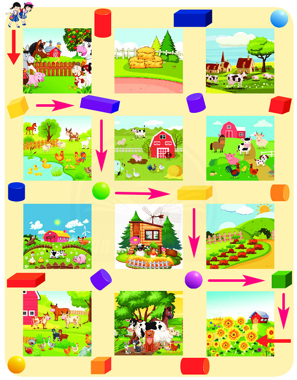 Xác định hình dạng của các khối rồi đi theo đường không có khối trụ để đến trang trại trồng hoa.