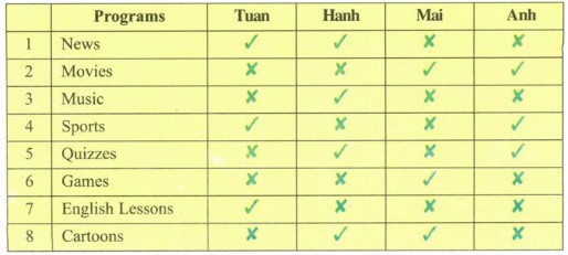 (Thực hành với một bạn cùng lớp. Hãy nhìn vào bảng. Hỏi và trả lời các câu hỏi về chương trình TV mà những người này thích và không thích. Sử dụng câu hỏi đuôi.)