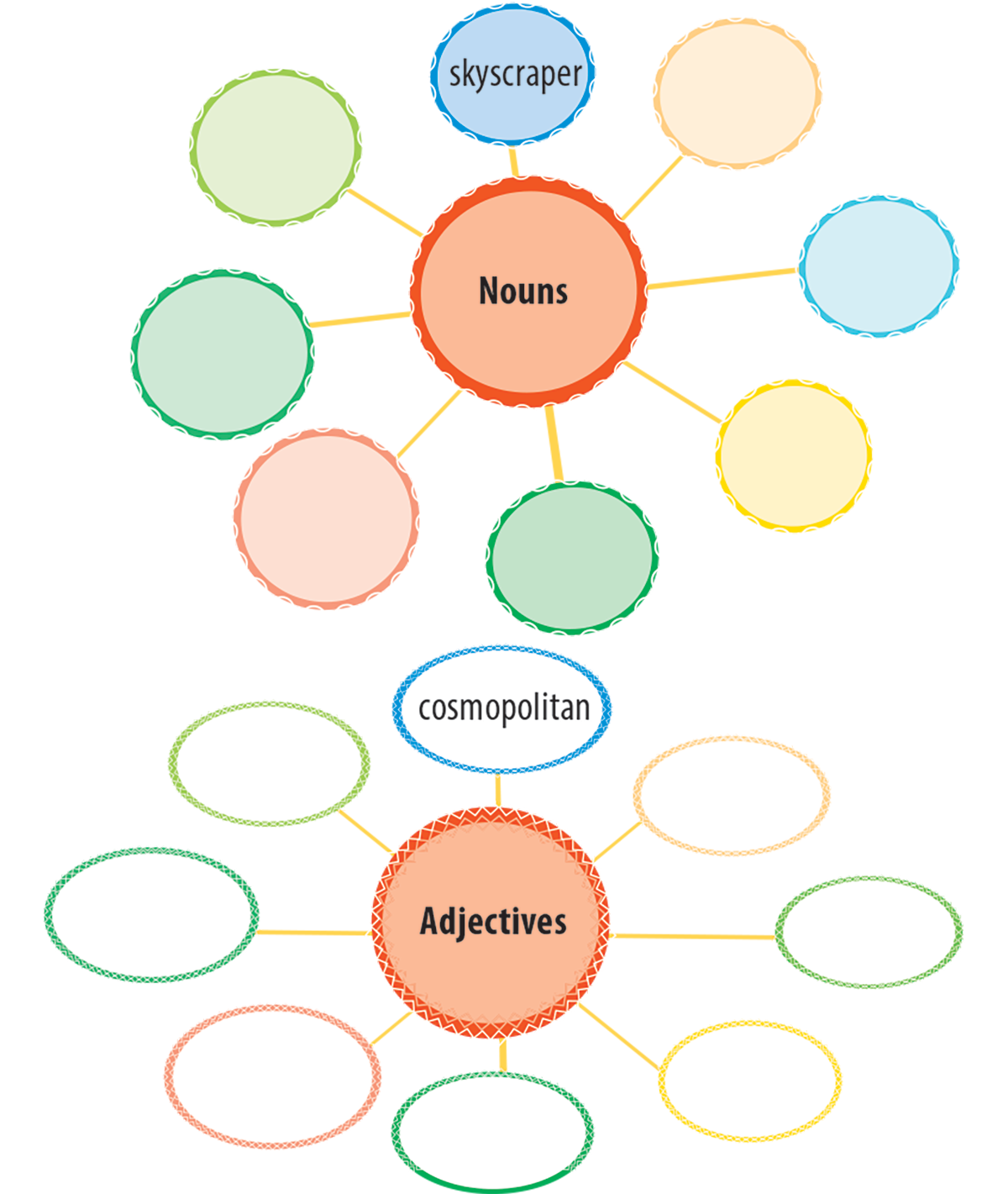 Task 1. Complete the word webs with nouns and adjectives connected with the city.