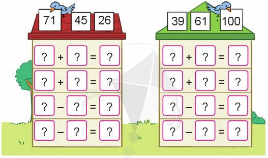 Nhẩm tính ta thấy số ở bảng có chú chim chính là tổng của hai số còn lại, từ đó ta viết được các phép tính đúng.