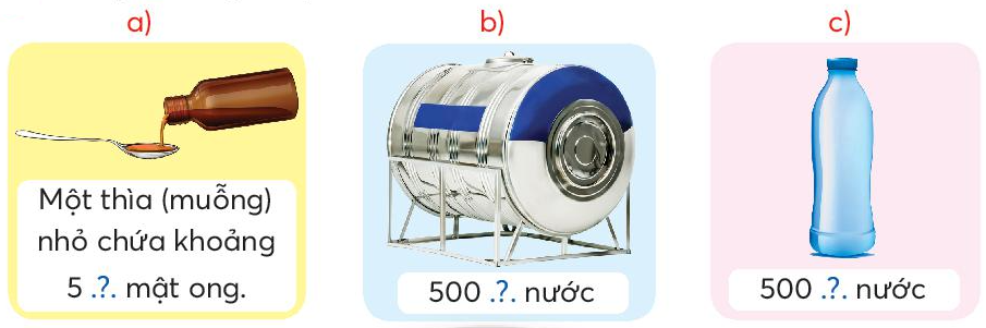 Em ước lượng dung tích của các đồ vật, sau đó điền đơn vị đo thích hợp.