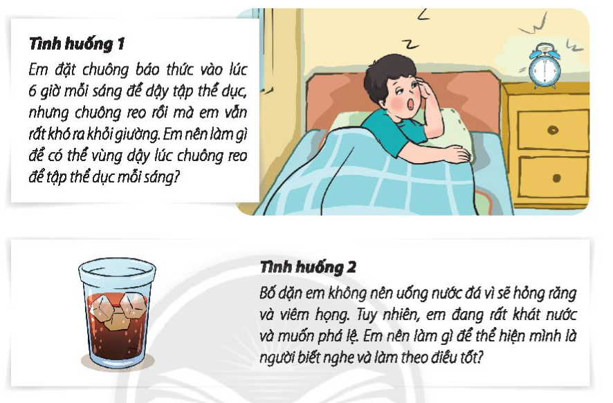 –   Tình huống 1: Em có thể ngủ sớm hơn vào hôm trước để có thể dậy sớm hơn. Em có thể đặt chuông cách nhau vài phút liên tiếp để có thể dậy được.
