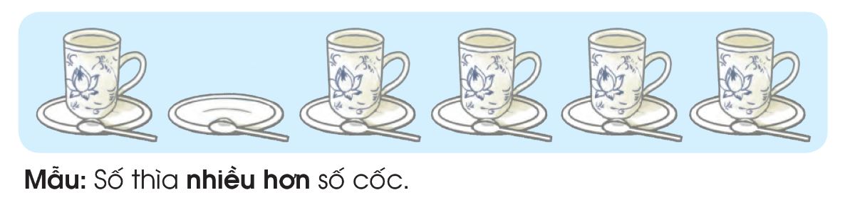 Quan sát hình và dùng các từ nhiều hơn, ít hơn, bằng nhau để nói về để nói về số cốc, số thìa và số đĩa.