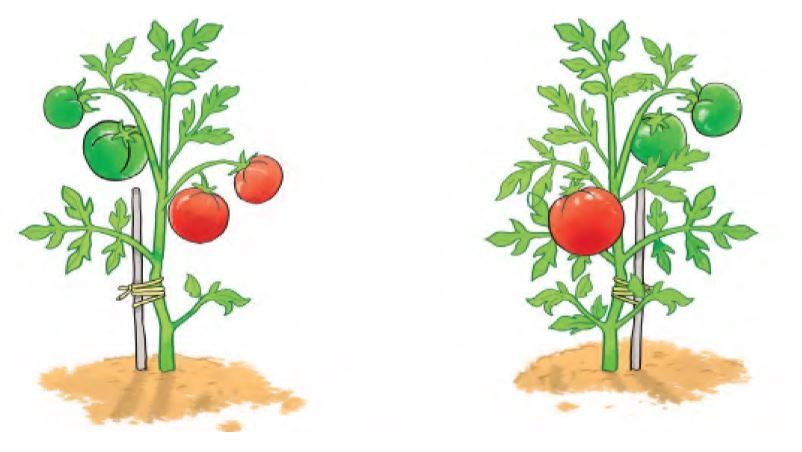 Cây bên trái có 4 quả; cây bên phải có 3 quả.
