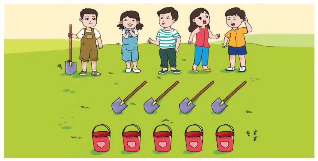 Dùng các từ: nhiều hơn, ít hơn, bằng nhau để nói về hình vẽ sau.