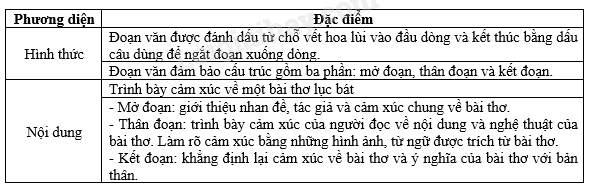 Đọc lại hai văn bản có trong SGK trang 75, điền nội dung và hình thức của một đoạn văn chia sẻ về cảm xúc một bài thơ lục bát vào bảng.