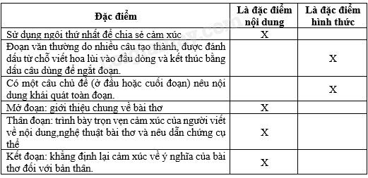 Trong bảng sau những đặc điểm nào thuộc về nội dung, đặc điểm nào thuộc về hình thức của đoạn văn ghi lại cảm xúc về một bài thơ lục bát (kẻ vào vở):