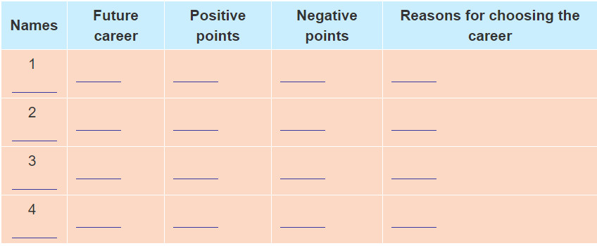 (Làm việc nhóm. Phỏng vấn thành viên trong nhóm của bạn về nghề nghiệp tương lai của họ. Sử dụng bảng dưới đây hướng dẫn.)