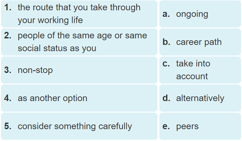 A career used to be understood as a single occupation that people did to earn a living. However, in the changing world of work, nowadays people have to keep learning and be responsible for building their future. Therefore, a career is now considered more than a job. Rather, it is an ongoing process of learning and development of skills and experience. Choosing a career path is hard – you have to consider many things. Firstly, you should consider what you like, what is most important to you, what you are good at and who is there to help you. For example, you may care mostly about earning as much money as possible or you may want to experience job satisfaction, or make a difference to society. Then, you should take into account education and learning styles. You may want to follow an academic route of high school, then college or university. Alternatively, you may opt for vocational training where you learn skills which can be applied directly to a job. Thirdly, you should do your own research to explore possible career paths. For instance, career paths in education include teaching, curriculum development, research or administration. Finally, speak to people. Your parents, your teachers, and even your peers can give you good advice.