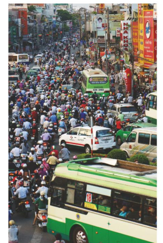 (Trong ảnh là rất nhiều phương tiện đang chạy trên đường: xe máy, ô tô, và xe buýt. Họ dường như đang bị kẹt trong một vụ tắc đường.)