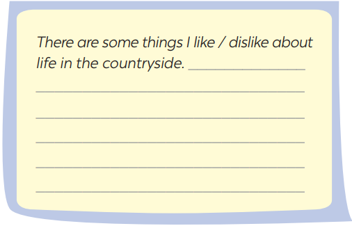 1. Work in pairs. Discuss the following question. 2. Listen to three people talking about life in the countryside. Choose the opinion (A – C) that each speaker (1 – 3) expresses. 3. Listen again and choose the correct answer A, B, or C. 4. Work in groups. Discuss and write what you like or dislike about life in the countryside. 5. Write a paragraph (80 – 100 words) about what you like or dislike about life in the countryside.