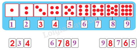 – Đếm số chấm tròn trên mỗi hình vuông rồi viết số thích hợp vào ô trống.