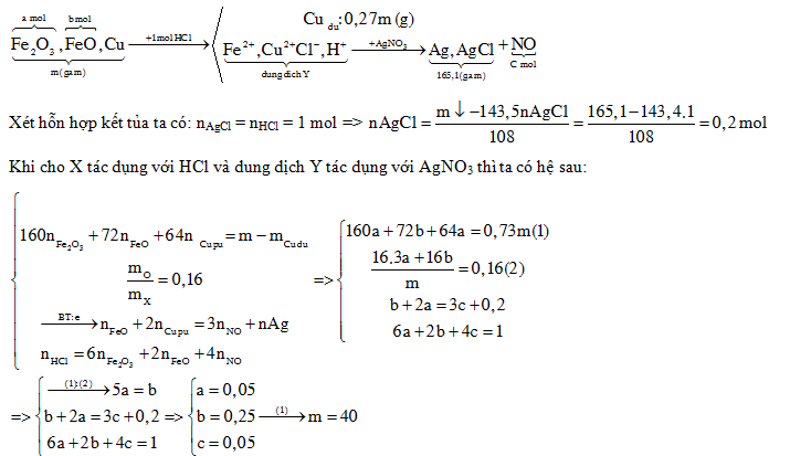 Hỗn hợp X gồm Fe2O3, FeO và Cu (trong đó nguyên tố oxi chiếm 16% theo khối lượng). Cho m gam X tác dụng với 500 ml dung dịch HCl 2M (dư), thu được dung dịch Y và còn lại 0,27m gam chất rắn không tan. Cho dung dịch AgNO3 dư vào Y, thu được khí NO (sản phẩm khử duy nhất của N+5) và 165,1 gam kết tủa. Biết các phản ứng xảy ra hoàn toàn. Giá trị của m là