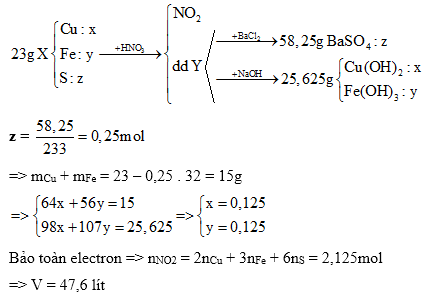 Cho 23 gam hỗn hợp X gồm Cu, Fe, Cu2S, CuS, FeS2 và FeS tác dụng hết với dung dịch HNO3(đặc nóng, dư) thu được V lít (ở đktc) khí NO2 duy nhất và dung dịch Y. Nếu cho toàn bộ Y vào một lượng dư dung dịch BaCl2, thu được 58,25 gam kết tủa. Mặt khác, khi cho toàn bộ Y tác dụng với dung dịch NaOH dư thu được 25,625 gam chất kết tủa. Giá trị của V là