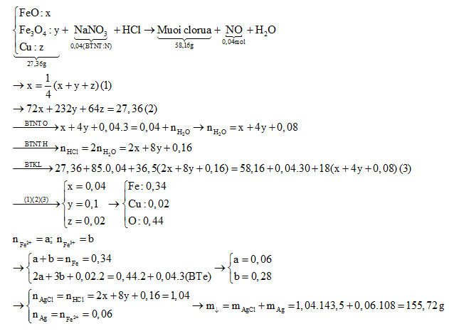 +) Gọi số mol FeO, Fe­3O4, Cu lần lượt là x, y, z => Pt (1) số mol của FeO