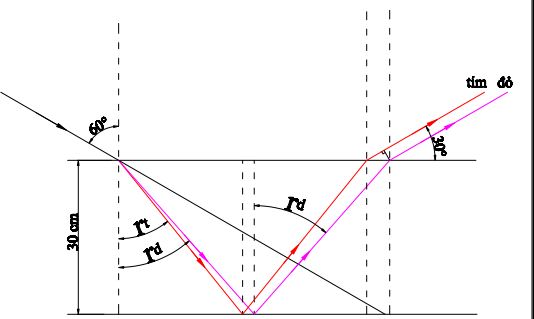 Bề rộng quang phổ tại mặt nước được tính theo công thức: \(L = 2h\left( {tan{\rm{ }}{r_d}-{\rm{ }}tan{\rm{ }}{r_t}} \right) = 4,5{\rm{ }}cm\)