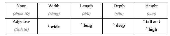 b Chúng ta có thể hỏi về kích thước với How + tính từ: How wide/ long/ far/ big/ deep vv is…? hoặc What’s the + danh từ: What’s the length / width / size, v.v. của …?