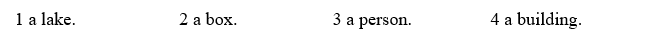 (Viết càng nhiều câu hỏi càng tốt mà bạn có thể hỏi về kích cỡ và kích thước của: 1. cái hồ; 2. cái hộp; 3. một người; 4. một tòa nhà.)