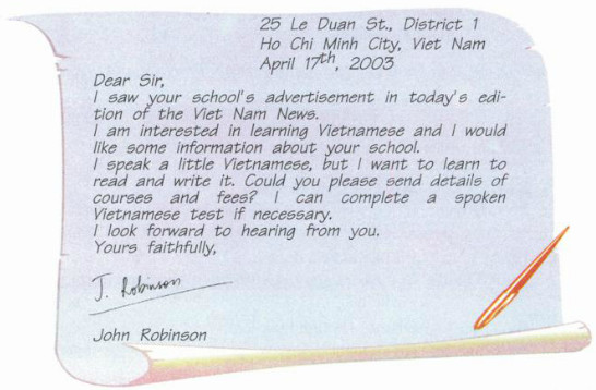 (Đọc quảng cáo trong phần 5. ĐỌC một lần nữa. Chọn một trong những trường bạn muốn theo học để cải thiện tiếng Anh của bạn. Viết thư yêu cầu cho tổ chức để yêu cầu nhiều thông tin về các khóa học và lệ phí. Thực hiện theo dàn bài dưới đây.)