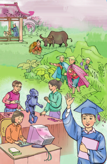 a) Trong bức tranh vẽ một người thầy đang dạy một nhóm học sinh học bài, một cậu bé đang ngồi ngoài đồng vừa chăn trâu vừa học bài, một đám bạn đang đội mưa đi đến lớp, một số bạn đang điều khiển robot, sử dụng máy tính và hình một bạn nhỏ mặc chiếc áo cử nhân.