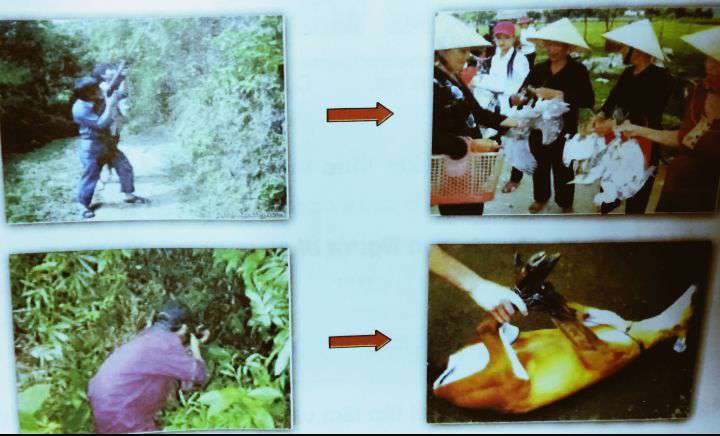 – Hình 1 và hình 2: Hai người thanh niên dùng súng săn để bắn chim, sau đó đưa người nhà đem bán.