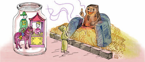 Bức tranh trên vẽ: một chàng kị sĩ rất bảnh, cưỡi ngựa tía, dây cương vàng và một nàng công chúa mặt trắng, ngồi trong mái lầu son đựng cẩn thận trong một chiếc lọ thủy tinh trong vắt. Ngoài ra, còn có một chú bé bằng đất và ông hòn Rấm đang trò chuyện rất vui vẻ.