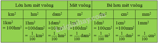 – Mỗi đơn vị đo diện tích gấp 100 lần đơn vị bé hơn tiếp liền.