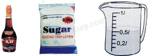 b) Em đố bạn đọc các kí hiệu \(0,2l\;;\;{\rm{ }}0,5kg\;;\;{\rm{ }}0,5l\) có trong các hình vẽ trên.