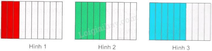 Hình 1 : \(\dfrac{3}{{10}}\) ;                       Hình 2 : \(\dfrac{5}{{10}}\) ;                      Hình 3 : \(\dfrac{6}{{10}}\).