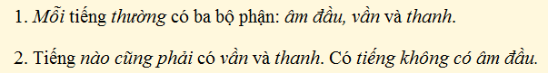 4) Mỗi tiếng thường do ba bộ phận tạo thành là âm đầu, vần và thanh.