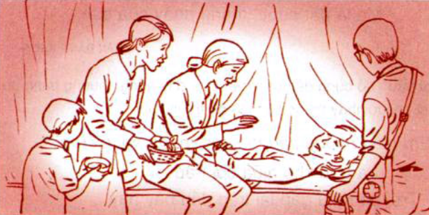 a) Những người trong tranh đang thăm hỏi người phụ nữ bị ốm: Hai người phụ nữ mang hoa quả đến thăm hỏi, ông bác sĩ đến thăm khám sức khỏe, cậu bé đang bưng một bát nước cho người bệnh uống.