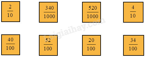 – Lấy các thẻ có ở các cặp phân số thập phân bằng nhau, chẳng hạn :