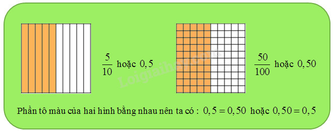 – Phân tô màu của hai hình bằng nhau nên ta có \(0,5 = 0,50\) hoặc \(0,50 = 0,5.\)