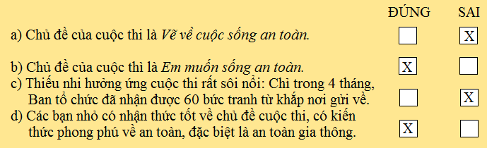 3) Những nhận xét sau đây đã thể hiện sự đánh giá cao khả năng thẩm mĩ của các em: Tranh của các em có “màu sắc tươi tắn, bố cục rõ ràng, ý tưởng hồn nhiên, trong sáng mà sâu sắc. Các họa sĩ nhỏ tuổi chẳng những có nhận thức đúng về phòng tránh tai nạn mà còn biết thể hiện bằng ngôn ngữ sáng tạo đến bất ngờ.”