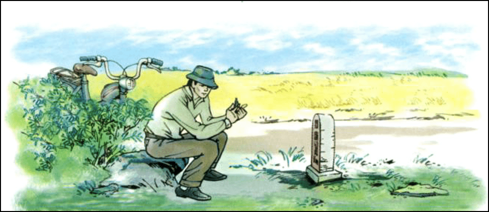 Anh dừng xe trước một cột cây số ven đường, giữa cánh đồng vắng. Tháo chiếc bu-gi ra xem, nhưng đôi mắt anh không nhìn chiếc bu-gi mà chăm chú quan sát mặt đất phía sau một cây số. Nó kia rồi! Một hòn đá hình mũi tên (lại hình chữ V quen thuộc) trỏ vào một hòn đá dẹt chỉ cách anh ba bước chân.