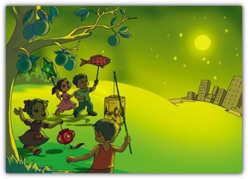 c) Bỏ lại sau lưng những tòa nhà thành phố cao ngất, các bạn nhỏ vui vẻ rước đèn đón tết trung thu ở một vùng quê thanh bình, bên cạnh còn có cây trái ngọt lành.