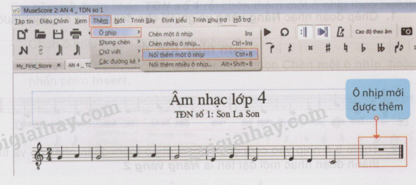 Để nối thêm một ô nhịp vào cuối đoạn nhạc, em thực hiện như sau: