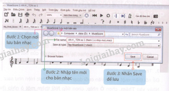Tiếp tục thực hiện ba bước như hình dưới để lưu những thay đổi thành bản nhạc mới
