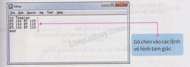 Bước 2. Gõ các lệnh vẽ hình tam giác trong cửa sổ soạn thảo