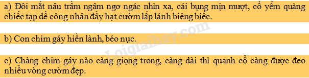 c. Chàng chim gáy nào giọng càng trong, càng dài thì quanh cổ càng được đeo nhiều vòng cườm đẹp.