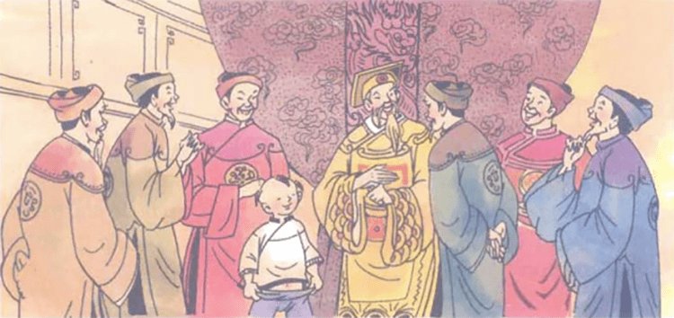 Cả triều đình háo hức nhìn con người phi thường vừa xuất hiện. Hóa ra, đó chỉ là một cậu bé chừng mười tuổi, tóc để trái đào. Nhà vua bèn ngọt ngào bảo cậu: