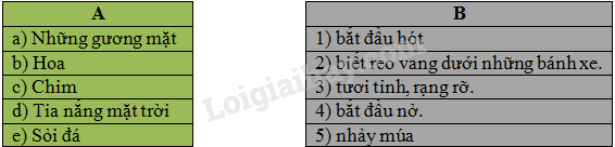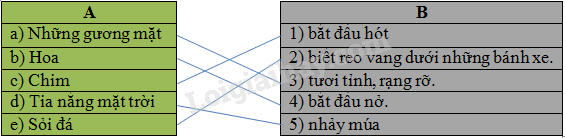 3) Nối từ ngữ chỉ sự vật ở cột A với từ ngữ tả sự vật đó ở cột B để tạo thành các câu nói về sự thay đổi của vương quốc khi có tiếng cười: