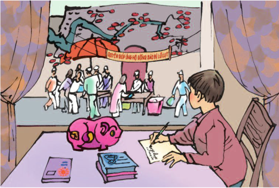 – Tranh vẽ cảnh mọi người đang quyên góp tiền, của để ủng hộ cho đồng bào vùng lũ lụt