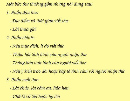 => Một bức thư thường kết thúc bằng viếc đưa ra lời chúc, lời cảm ơn, hứa hẹn. Ngoài ra còn có chữ kí và tên hoặc họ tên của người viết thư.