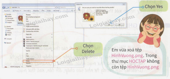 Bước 1. Nháy nút phải chuột vào tệp HinhVuong.png rồi chọn Delete