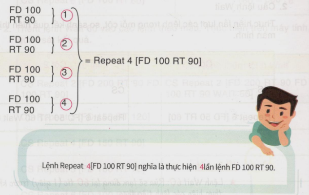 Với cấu trúc câu lệnh lặp Repeat n [<các câu lệnh lặp lại>], Rùa sẽ lặp lại n lần các lệnh đặt trong cặp dấu [. . .]