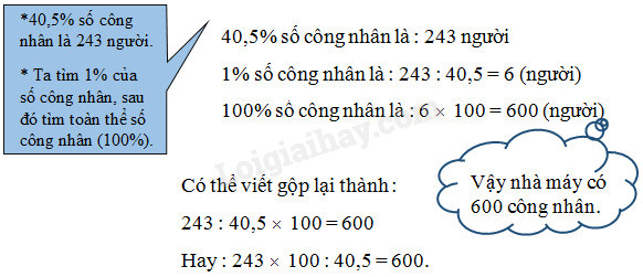 Ví dụ : Số công nhân nữ của một nhà máy là 243 người và chiếm 40,5% số công nhân toàn nhà máy. Hỏi nhà máy đó có tất cả bao nhiêu công nhân ?