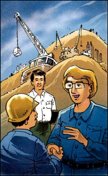 Chiếc máy xúc của tôi hối hả “điểm tâm” những gầu chắc và đầy. Chợt lúc quay ra, qua khung cửa kính buồng máy, tôi nhìn thấy một người ngoại quốc cao lớn, mái tóc vàng óng ửng lên một mảng nắng. Tôi đã từng gặp nhiều người ngoại quốc đến tham quan công trường. Nhưng người ngoại quốc này có một vẻ gì nổi bật lên khác hẳn các khách quan khác. Bộ quần áo xanh màu công nhân, thân hình chắc và khỏe, khuôn mặt to chất phác…, tất cả gợi lên ngay từ phút đầu những nét giản dị, thân mật.